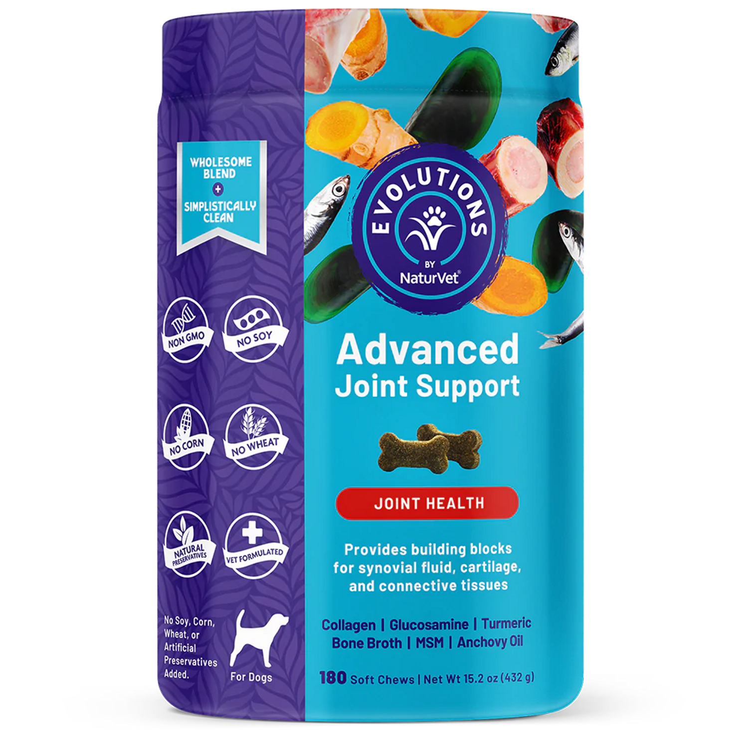 Evolutions Advanced Joint Support Chews are for dogs over the age of 12 weeks. Wholesome blend provides the building blocks for synovial fluid, cartilage, and connective tissue to enhance connective tissue pliability and healthy joint fluid viscosity for healthy bones and joints. May help relieve occasional joint stiffness and inflammation associated with training, competition, and normal daily exercise and activity. Fatty acids are vital to everyday health, strong muscles, and healthy joints.