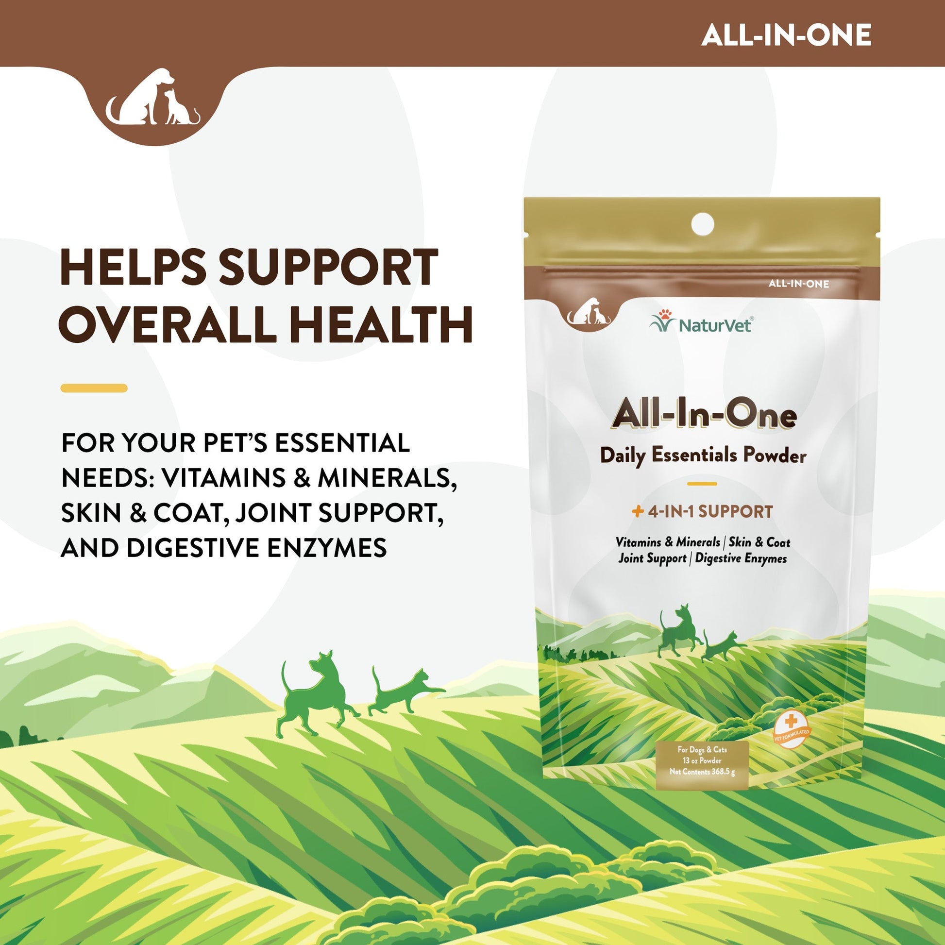 All-In-One Powder is four supplements in one that support digestion, skin and coat, joints, and overall health.