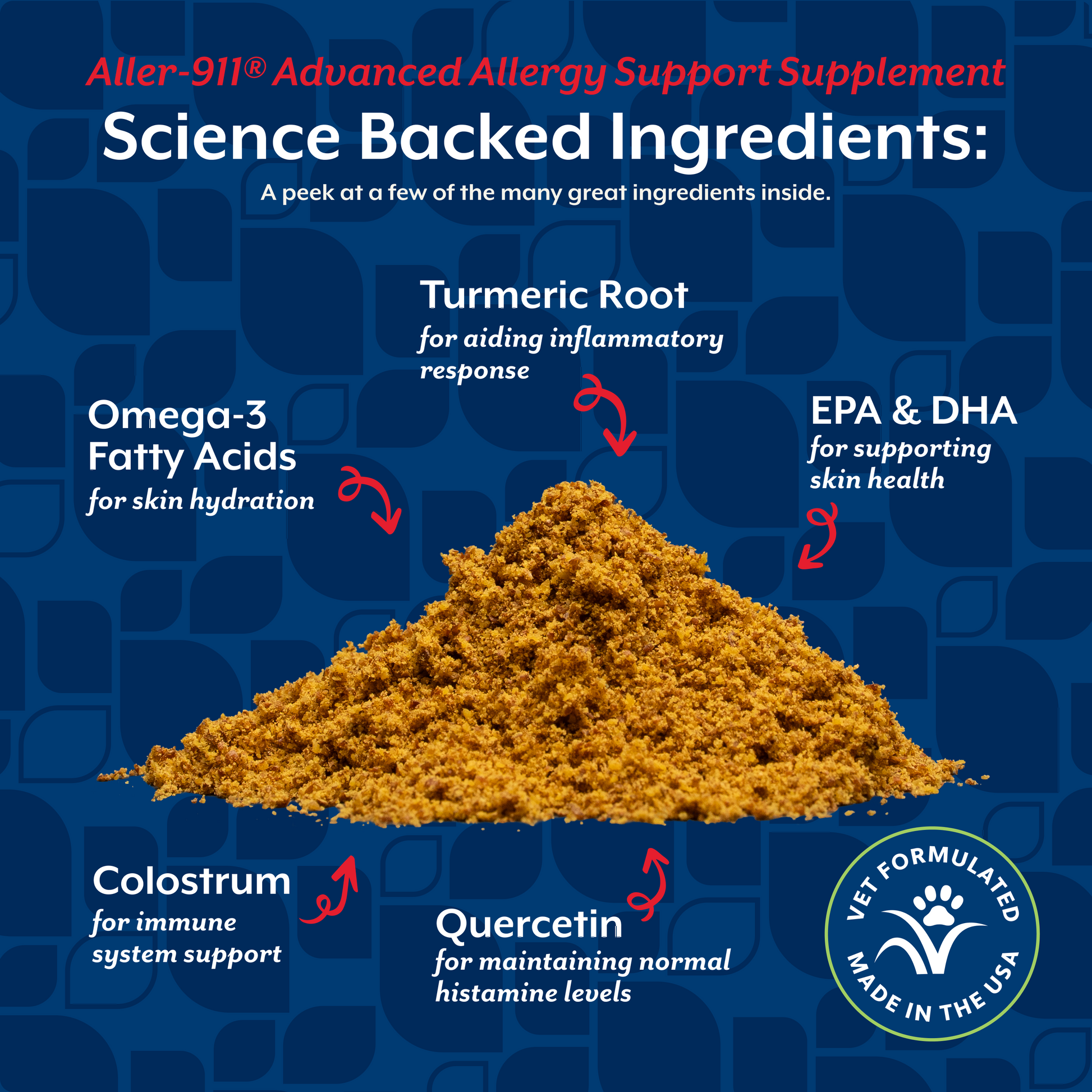 Help your dog and cat fight allergies the easy way with Aller-911® Advanced Allergy Support Powder, a powerful blend of anti-inflammatory herbs, immune-boosting, and skin-soothing ingredients. Veterinarian formulated to help reduce itching, sneezing, hot spots, and seasonal flare-ups. Seasonal allergy relief they can feel, comfort you can see.