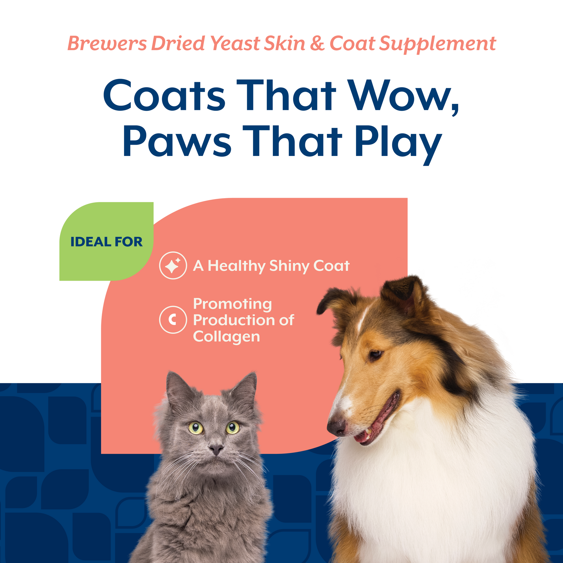 For use in dogs and cats only. Veterinarian formulated for use in dogs and cats over the age of 12 weeks. Contains Brewers Dried Yeast, B-Complex Vitamins (Thiamine, Riboflavin, and Niacin) to help support healthy skin and a shiny coat. With Vitamin C to promote the production of Collagen.