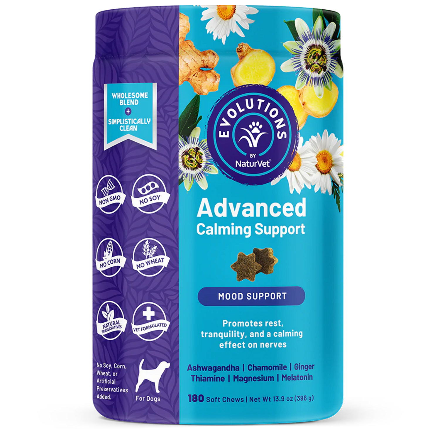 Evolutions Advanced Calming Soft Chews are for dogs over the age of 12 weeks. Advanced Calming Support helps to balance the serotonin and dopamine levels and provides neuromuscular support for a complete synergistic calming approach. Perfect for dogs exhibiting nervousness, hyperactivity, discontentment or responding to environmentally induced stress. Helps maintain contentment during separation, travel, motion sickness, storms, fireworks, and changes in daily routine.