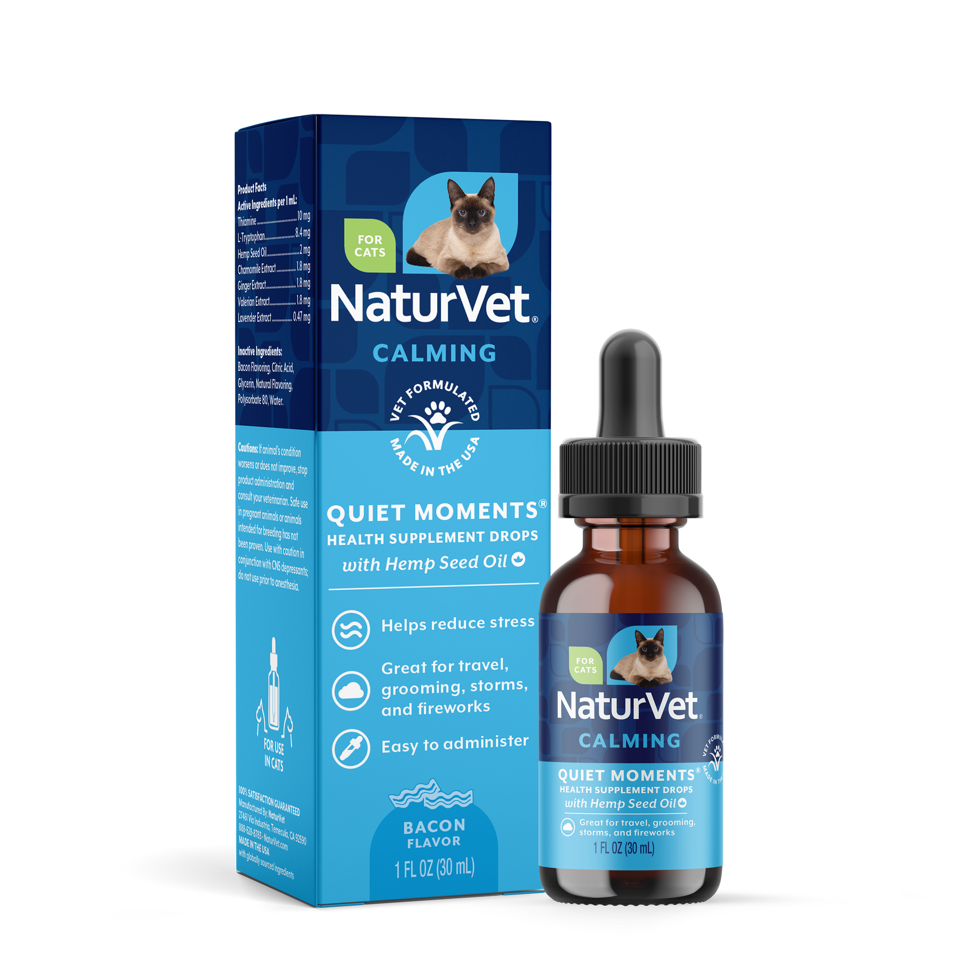 Help your cat feel calm, relaxed, and at ease. Quiet Moments® with Hemp Seed Oil Calming Drops are a gentle, fast-acting liquid designed to help ease tension and promote relaxation in cats. Veterinarian formulated with Hemp Seed Oil, Thiamine, L-Tryptophan, Chamomile, Ginger, and Valerian, this soothing blend supports a balanced mood and helps cats stay calm during stressful times like travel, thunderstorms, fireworks, vet visits, or separation.