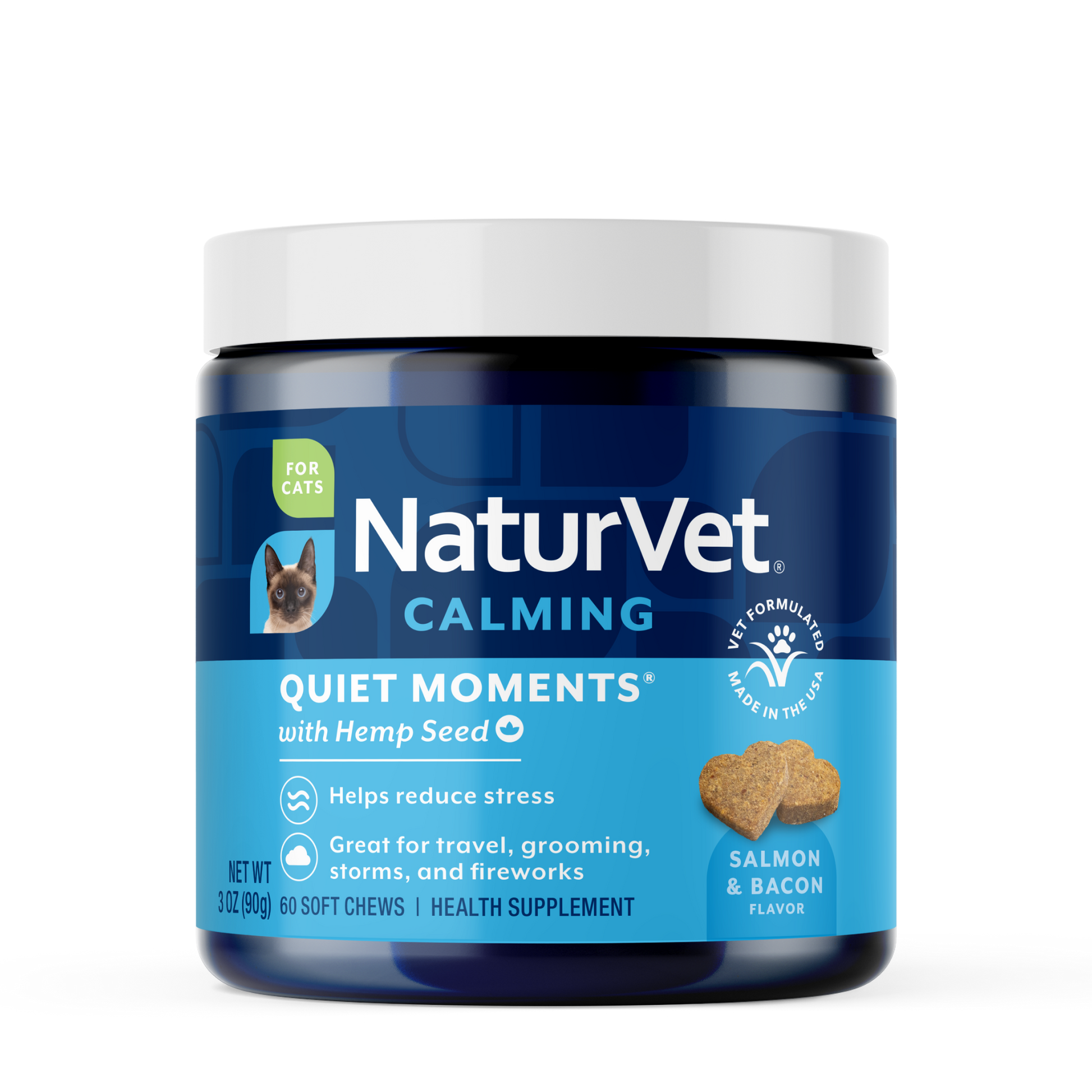 Help your cat find their calm with our tasty Quiet Moments® with Hemp Seed Calming Soft Chews, the perfect supplement for cats who experience stress or anxiety. Whether it's thunderstorms, fireworks, travel, or separation, these veterinarian formulated soft chews contain a unique blend of ingredients to support relaxation and reduce tension.