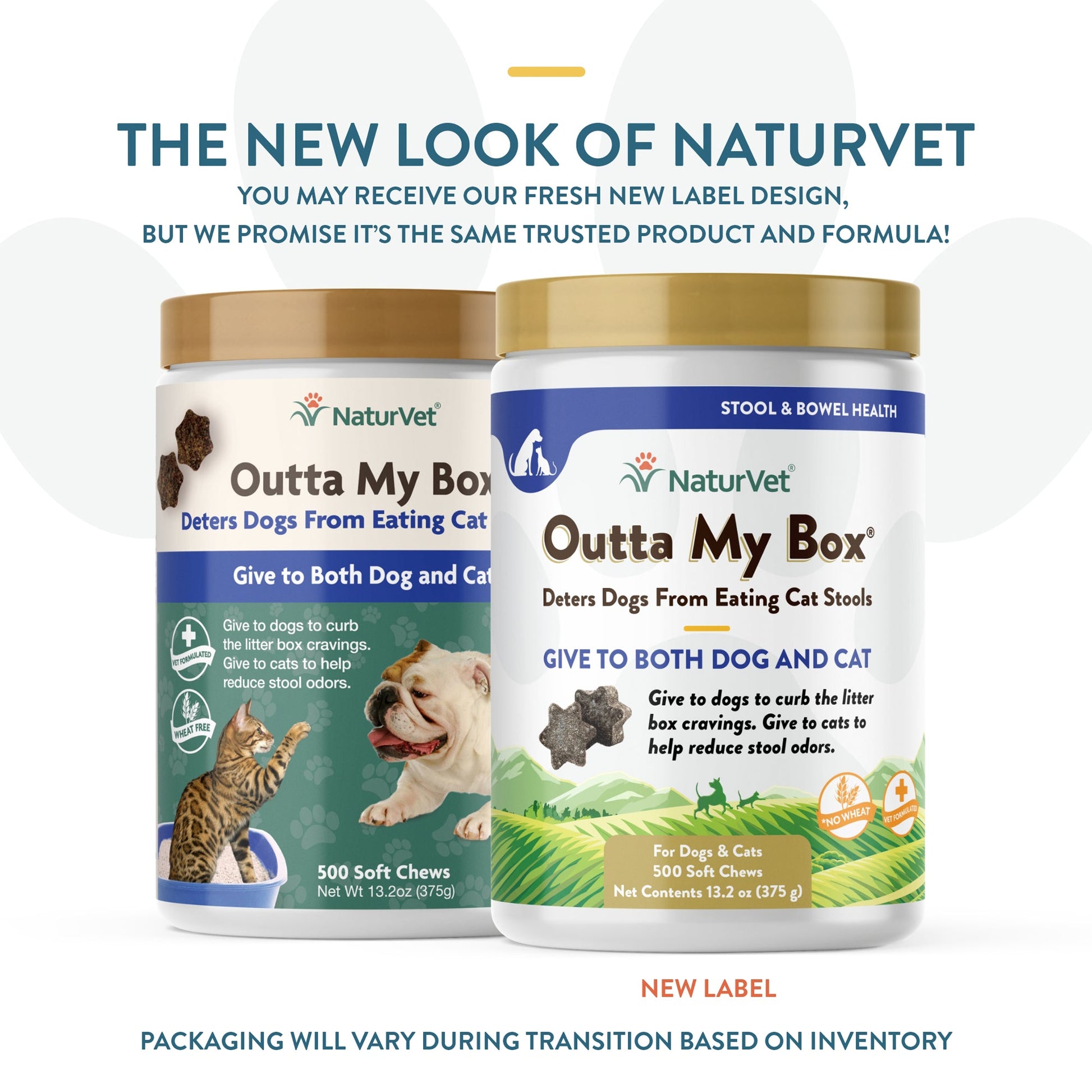 Do you have a dog that invades the litter box to snack on cat stools? If you do, stop the worry and hassle of monitoring your dog and guarding your cat’s litter box. Simply give our tasty Outta My Box® Soft Chews to both the dog and cat. Our veterinarian formulated ProBioStrive™ contains active ingredients to provide a dual action process.