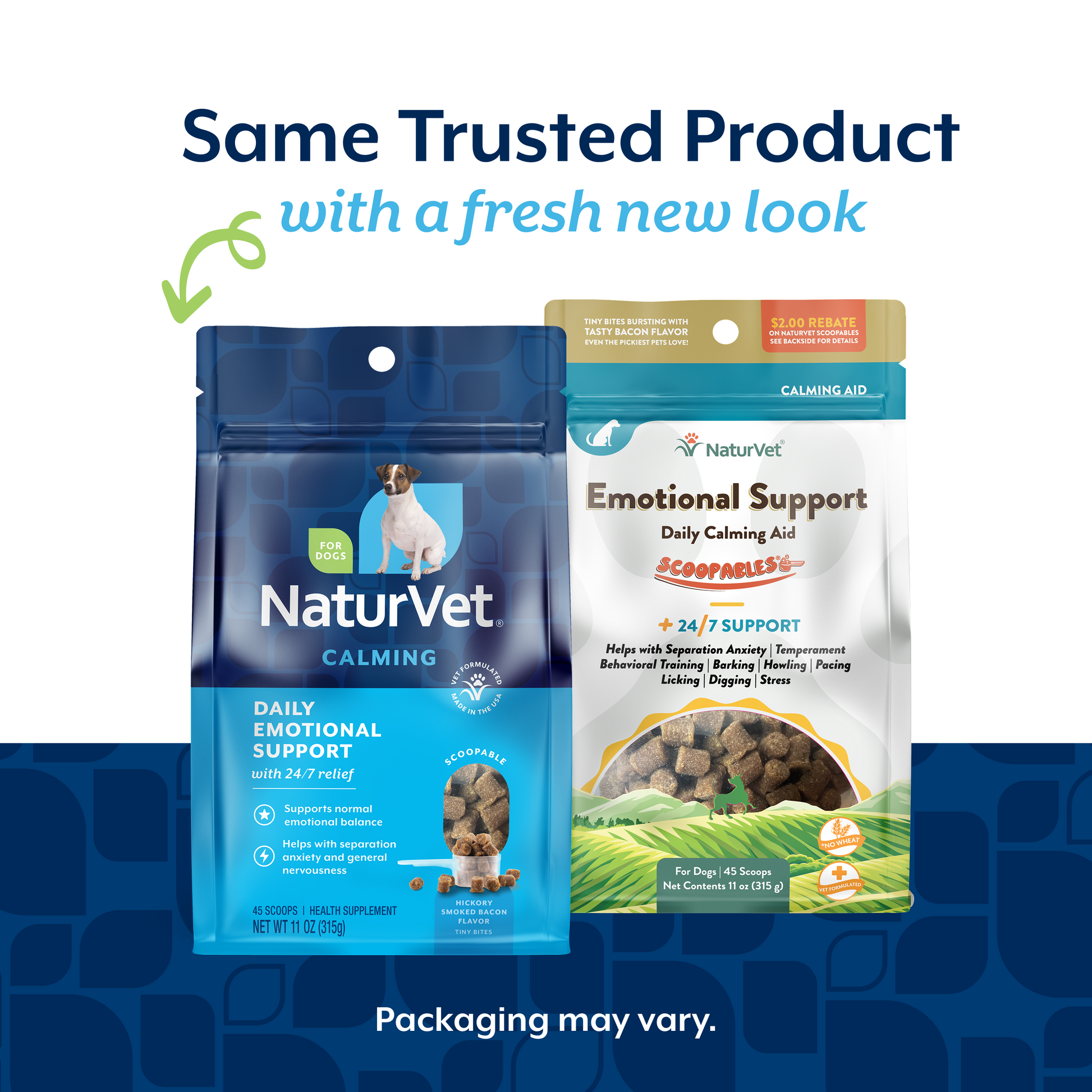 Help your pup find daily balance with our veterinarian formulated Daily Emotional Support Calming Scoopable Tiny Bites for stress, separation anxiety, and nervous habits. With a gentle blend of Melatonin, Magnesium, Passion Flower, Chamomile, and B-Vitamins, they promote relaxation, help ease stress and tension, and support sensitive tummies. The hickory-smoked bacon flavor turns emotional support into a moment of joy.