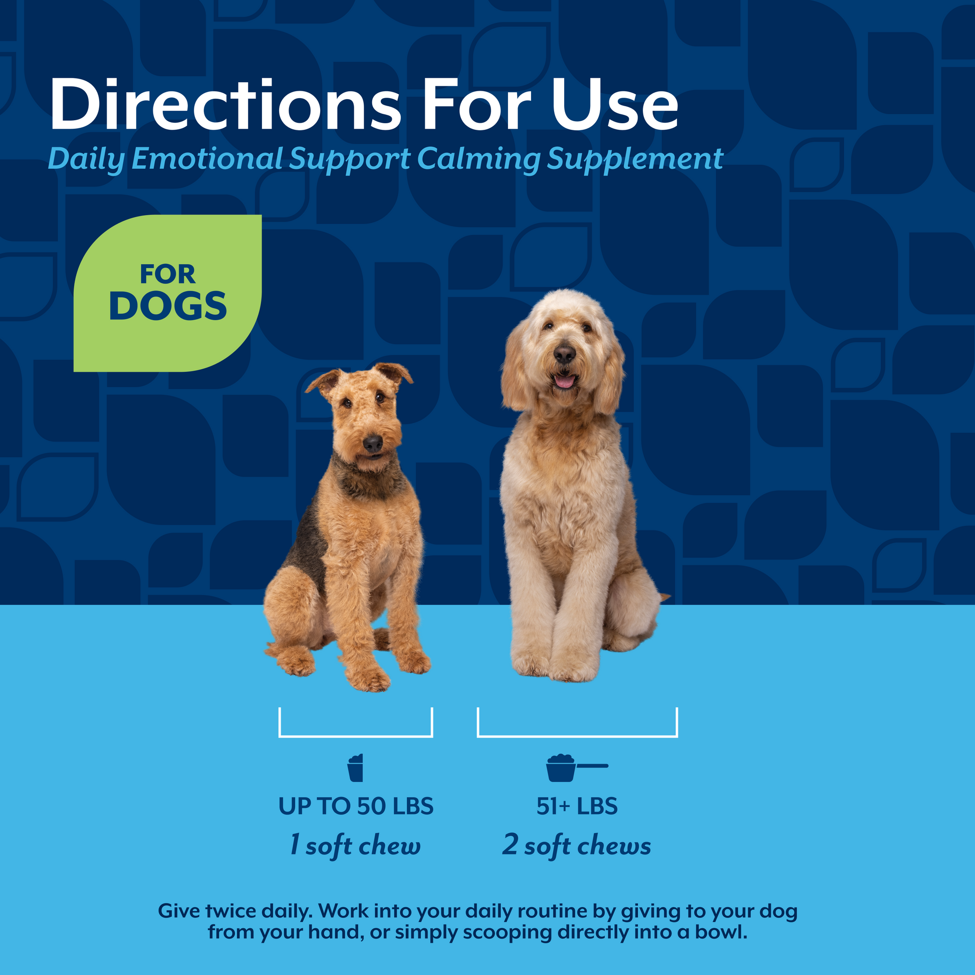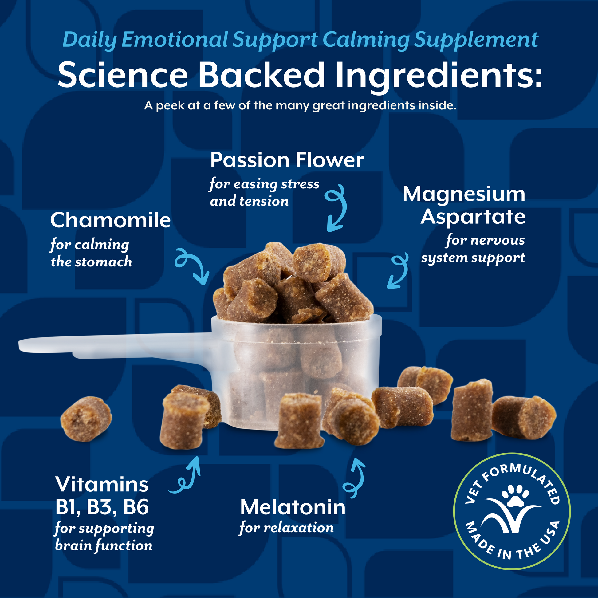 For use in dogs only. Veterinarian formulated for use in dogs over the age of 12 weeks. Contains botanicals to help promote normal emotional balance. With B-Vitamins to support calm behavior, a blend of Magnesium Aspartate, Passion Flower, and Melatonin to help promote restful relaxation, and Chamomile to support sensitive stomachs.